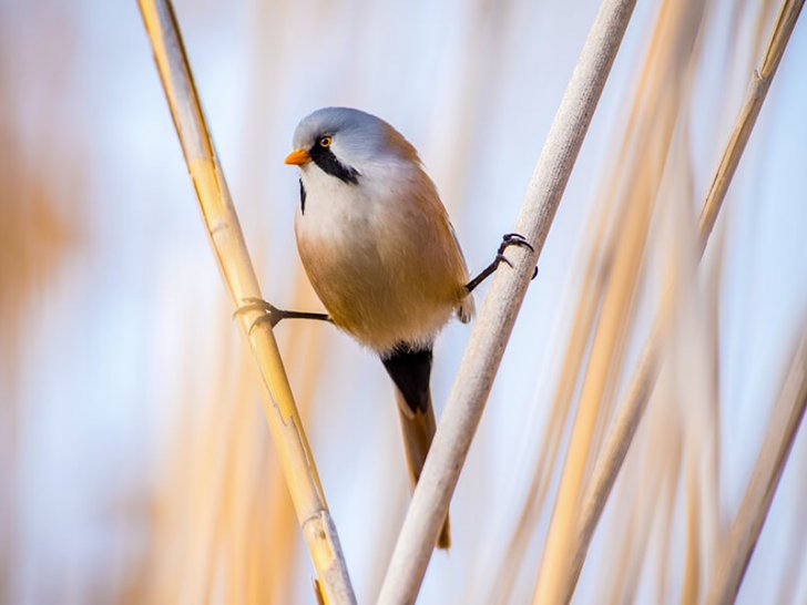 Усатые синицы быстро перемещаются по тростнику, их крепкие пальцы цепко обхватывают стебли, а хвост помогает держать равновесие. Эти птички летают над тростниковыми зарослями, но далеко от них, обычно, не перемещаются. Чуть что, и усатые синицы сразу же скрываются в тени тростниковых крепей.