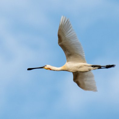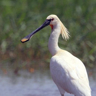 Взрослые птицы в брачном наряде чисто-белые, с желтоватым налетом на зобу, на голове — пышный лежачий хохол, горло неоперенное, желтое, ноги и клюв черные, только кончик «лопаточки» желтый, глаза красно-коричневые. В зимнем наряде хохол и желтизна на зобу исчезают. Молодые птицы отличаются от взрослых розоватым клювом и телесного цвета ногами. С возрастом и ноги и клюв постепенно сереют и темнеют, на концах маховых перьев у них выражены темные ободки. Исключительно молчалива: птенцы тонко верещат, взрослые иногда издают негромкие тявкающие звуки.