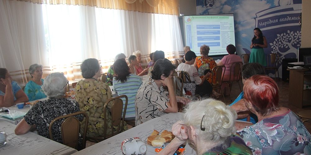 Каждую неделю в понедельник и четверг студенты «третьего возраста» слушают лекции, на одну из таких лекций организаторы пригласили заместителя директора по эколого-просветительской работе Астраханского биосферного заповедника Наталью Мех. Лекция об истории и деятельности заповедника проходила оживленно: «академики» внимательно слушали, активно задавали вопросы, интересовались обитателями заповедника, приводили свои примеры встречи с дикими животными в дельте, восхищались волжскими красотами. Особенно поразил слушателей рассказ о тяжелых буднях госинспекторов, которым приходится не только противостоять браконьерам, но и вступать в неравный бой с растительными пожарами, которые могут нанести непоправимый ущерб без исключения всем обитателям заповедника, в одночасье, уничтожив естественную среду их обитания и погубив их самих и их потомство. Неожиданный интерес вызвала информация о пресмыкающихся, обитающих в заповеднике.