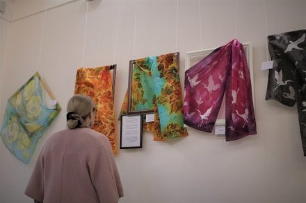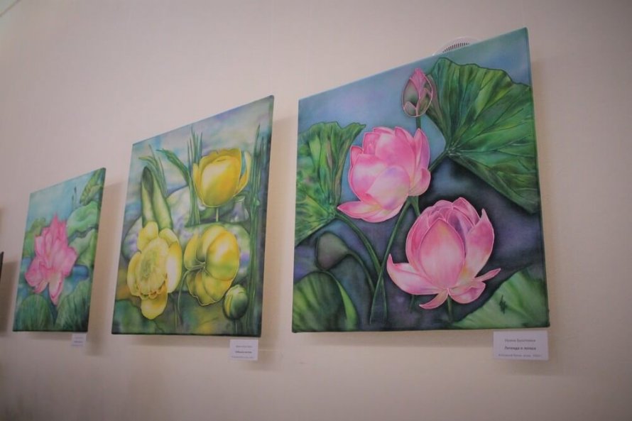 Яркие жёлтые листья на шёлковом платке или цветущие лотосы, распустившиеся на холсте, а, может быть, прохладные завораживающие оттенки заката над Волжской дельтой. Ирина Букоткина умело играет с различными техниками декоративно-прикладного искусства, чтобы передать всю многогранность заповедной природы Астраханского края. Все работы выполнены за год сотрудничества с Астраханским биосферным заповедником.