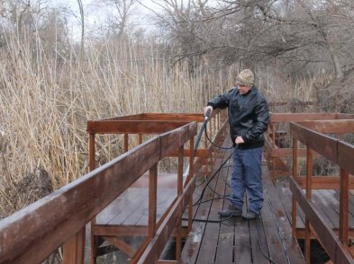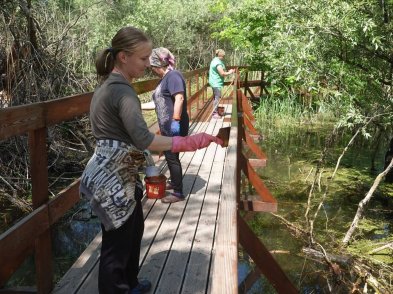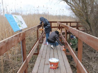 К этому дню также была завершена покраска и обновление экологической тропы «Обретённая дельта» на Дамчикском участке Астраханского заповедника. Задача предстояла нелёгкая – длина тропы составляет 1700 метров. Предварительно была проведена подготовительная работа – государственные инспекторы заповедника очистили настил тропы от биологических загрязнений (листьев, помёта и т.п.) кёрхерами. Следующий этап – покраска – позволил привлечь много людей, в том числе и волонтеров. Еще в марте 2020 года, до карантина, участники XV Волонтёрской полевой школы – добровольцы из различных регионов страны, начали эту работу, им на помощь приезжал экологический десант из Управления заповедника. Работы по подготовке тропы к новому туристическому сезону завершили сотрудники Дамчикского участка. Этот объект пользуется большой популярностью у наших посетителей и, надеемся, уже в скором времени, после снятия ограничительных мер, вновь примет своих экскурсантов.