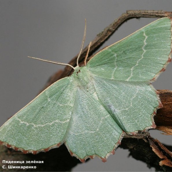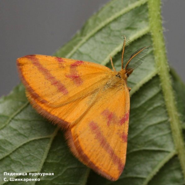 Пяденица пурпурная – очень яркая бабочка. Передние крылья самцов оливково-зеленые, самок – желто-оранжевые, с пурпурными поперечными полосами. Задние крылья желто-оранжевые, с пурпурной бахромой по внешнему краю. Усики желто-оранжевого цвета, у самцов они перистые. Кормовые растения гусениц: щавель, спорыш, горец и др.