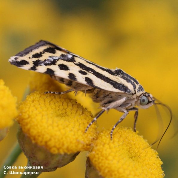 Следующая бабочка, которую можно встретить в островной зоне дельты – Совка вьюнковая. Кормовым растением гусениц этой бабочки является вьюнок полевой. Насекомое активно почти круглосуточно. Несмотря на мелкие размеры, легко запоминается благодаря характерной контрастной окраске: передние крылья ярко–желтого цвета, с рисунком из черных продольных и поперечных полос и пятен.
