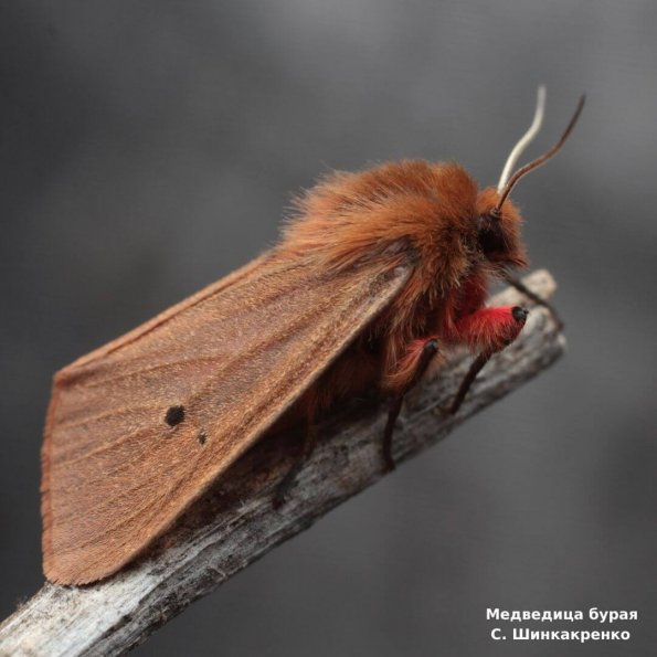 В луговых биотипах островной части дельты можно увидеть Медведицу бурую. У бабочки яркое красное брюшко с чёрной прерывистой полосой. Взрослое насекомое питается нектаром и пыльцой на цветущих растениях. За год развивается два поколения: первое с апреля по июнь, второе – с июля по сентябрь. Бабочка активна в ночное время, хорошо летит на свет.