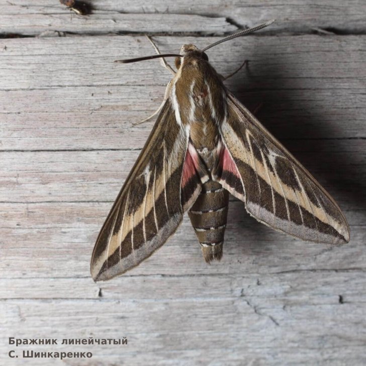 Бражник линейчатый – субтропический мигрирующий вид. Длина 30-40 мм, размах крыльев 65-85 мм. Самки немного крупнее самцов. Передние крылья темно-коричневые, со светлыми контрастно выделяющимися продольной полосой и жилками. Задние крылья черные, с широкой розоватой перевязью. Активен в ночное время, питается в сумерках на цветках, предпочтительно кормовые растения гусениц – щавели и горцы, реже другие растения.