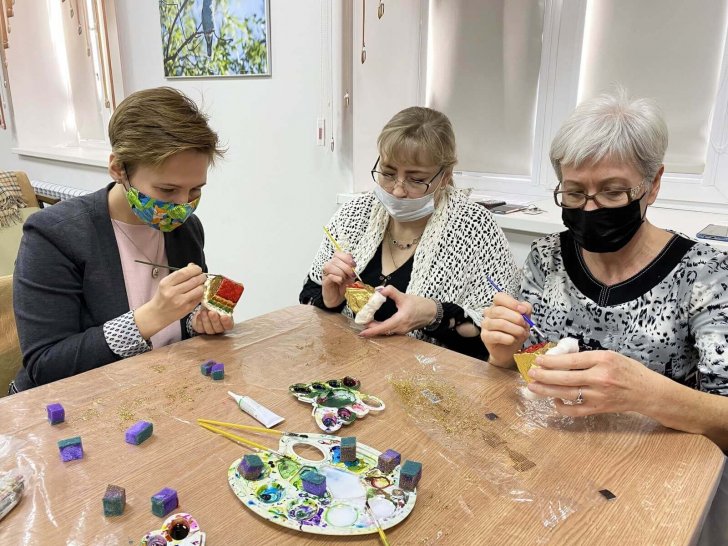 Роспись ёлочной игрушки – процесс увлекательный, но кропотливый. В качестве объекта для творчества был выбран сказочный миниатюрный домик. Сначала заготовку требовалось аккуратно покрыть клеем, а затем нанести равномерный слой золотой потали. А вот уже после этого этапа начинается самое настоящее творчество. Заготовка у всех участниц была одинаковая, а вот какими красками «заиграет» новогодний домик – это уже решали сами мастерицы. Работали специальными витражными лаками и блестящими контурами, которые требуют аккуратного обращения. Кто-то предпочёл раскрасить крышу красным лаком, кто-то зелёным, некоторые сделали яркую роспись на всей стене дома, где-то появились другие персонажи, например, сказочные коты. Для создания новогоднего настроения крыши домиков многие участницы украсили белым контуром и специальными блёстками, которые имитируют снег.