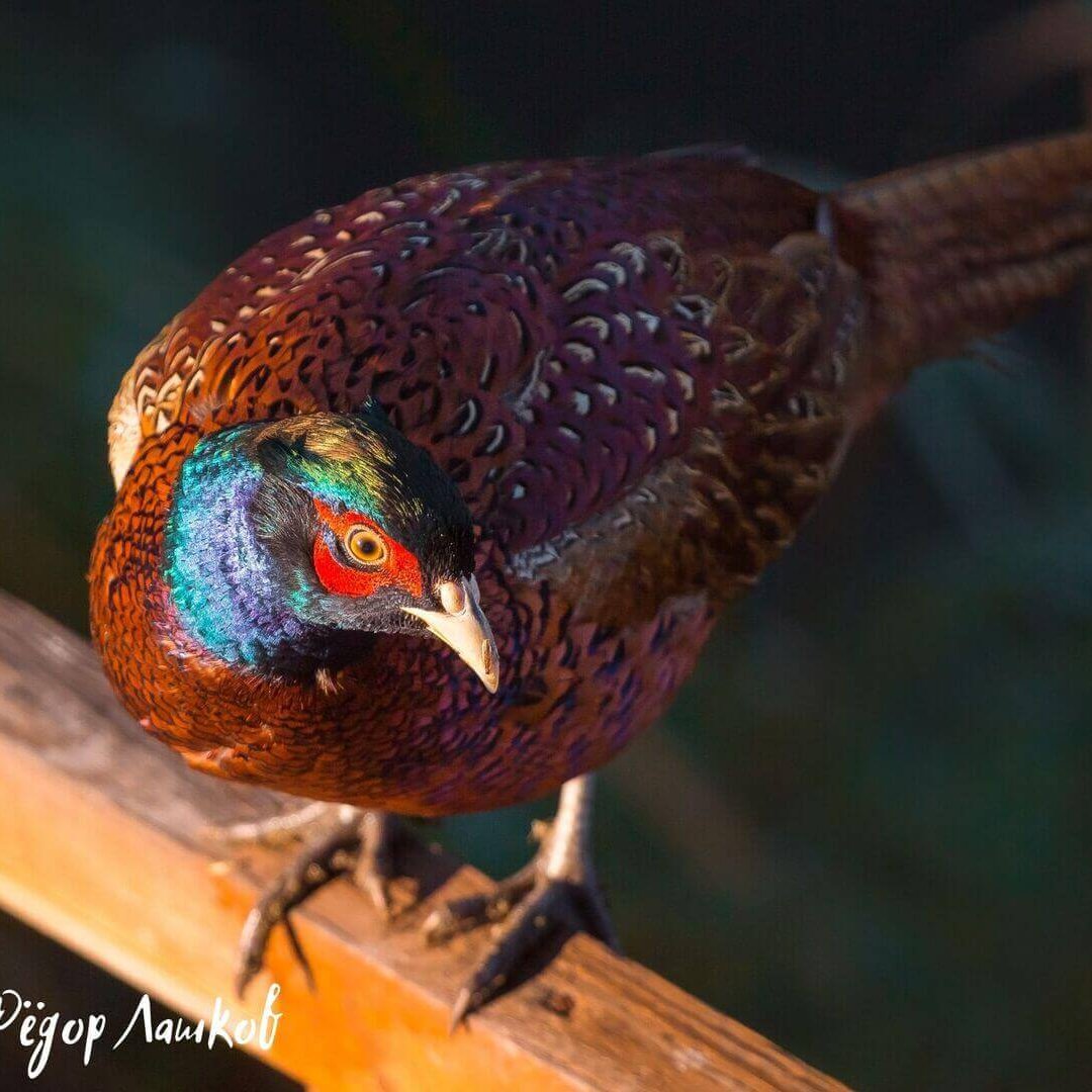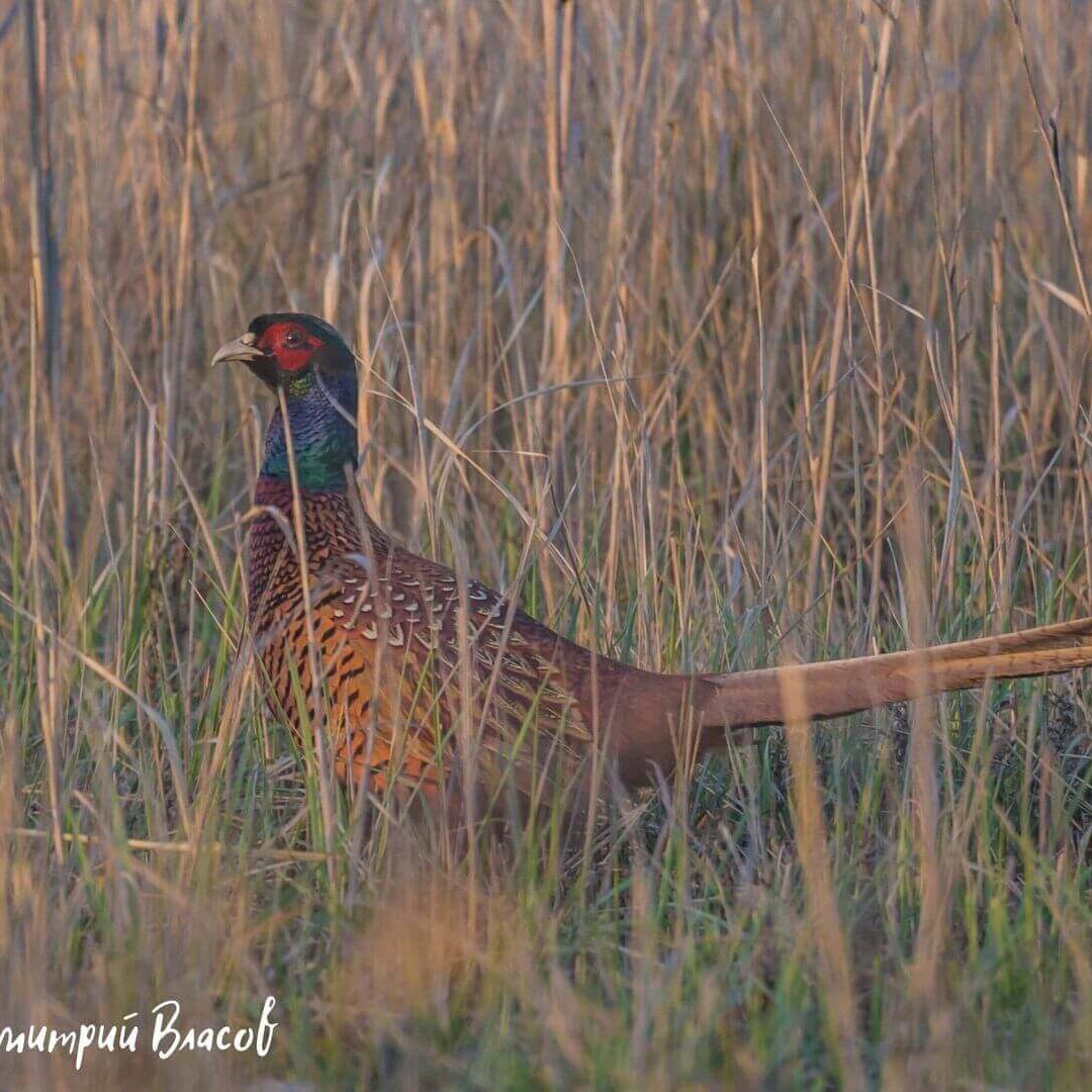 Следующего пернатого нередко сравнивают с той самой жар-птицей из одноименной сказки. Речь идёт о фазане, но ярким оперением отличаются лишь самцы. Это длиннохвостая птица, размером с домашнюю курицу. Самец окрашен в яркие медно-красные тона, голова и шея тёмно-зелёные, бока и передняя часть шеи сине-фиолетовые с металлическим отливом. Бока тела золотисто-оранжевые, брюшко чёрно-бурое. Крылья короткие, закруглённые, светло-коричневой окраски. По бокам головы ярко-красные участки голой кожи – «щёки» и пучки удлинённых перьев – «уши». Хвост клиновидный, очень длинный, особенно у самцов. Самка песочно-бурая с тёмными пестринами. Молодые птицы не яркие и похожи на самок. От других куриных отличается крупными размерами, яркой окраской и длинным хвостом.