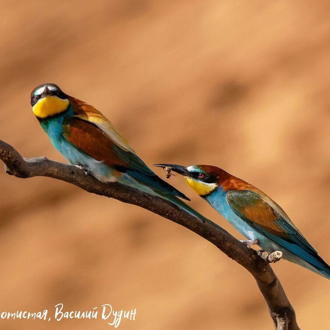 И первой птичкой станет яркая золотистая щурка. Издалека неосведомлённый человек может запросто спутать этого пернатого с каким-нибудь экзотическим попугаем, настолько у золотистой щурки красивое и броское оперение. Когда эти птицы парят в воздухе, то кажется, что мимо проносятся небольшие цветные стремительные вихри. Золотистая щурка большими размерами не отличается, она несколько крупнее скворца. Верх головы, шея и передняя часть спины каштановые, поясница золотистая, брюшко голубое. Крылья заострённые, буровато-синие. Хвост зелёный, а через глаз проходит чёрная полоса, лоб белый с голубым. В Астраханском заповеднике отмечается в апреле-мае и в конце июля-сентябре.