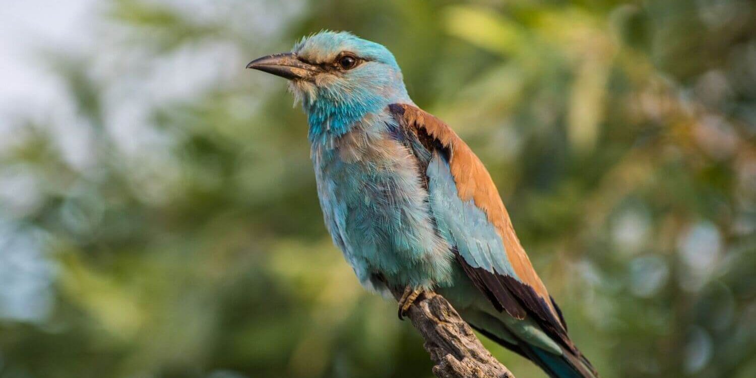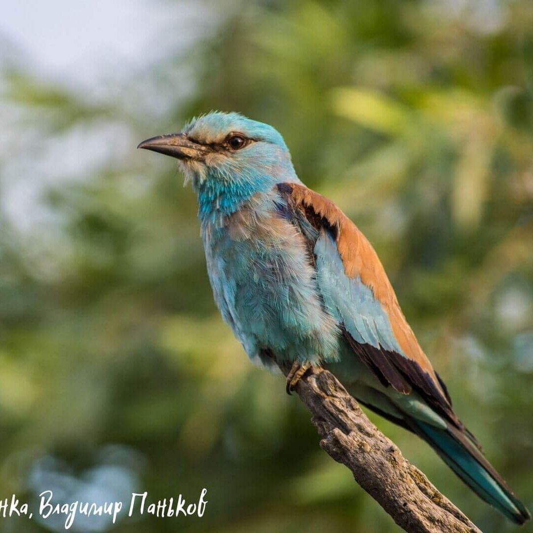 Яркая сизоворонка становится второй в нашем топе. Эта птицам размером с галку, общая окраска зеленовато-голубая, спина глинисто-коричневая. На крыльях и хвосте тёмно-синие участки. Концы крыльев и поясница тёмно-бурые, хвост голубой с тёмно-бурой продольной полосой. От клюва через глаз тянется чёрная полоса. Клюв прямой, мощный, слегка крючковатый, тёмно-бурый, ноги бурые. Самец и самка имеют одинаковую окраску. От щурок отличается крупными размерами, от врановых – яркой окраской. Интересно, что эта питается не только крупными насекомыми, но и мелкими позвоночными – ящерицами, грызунами, лягушками.
