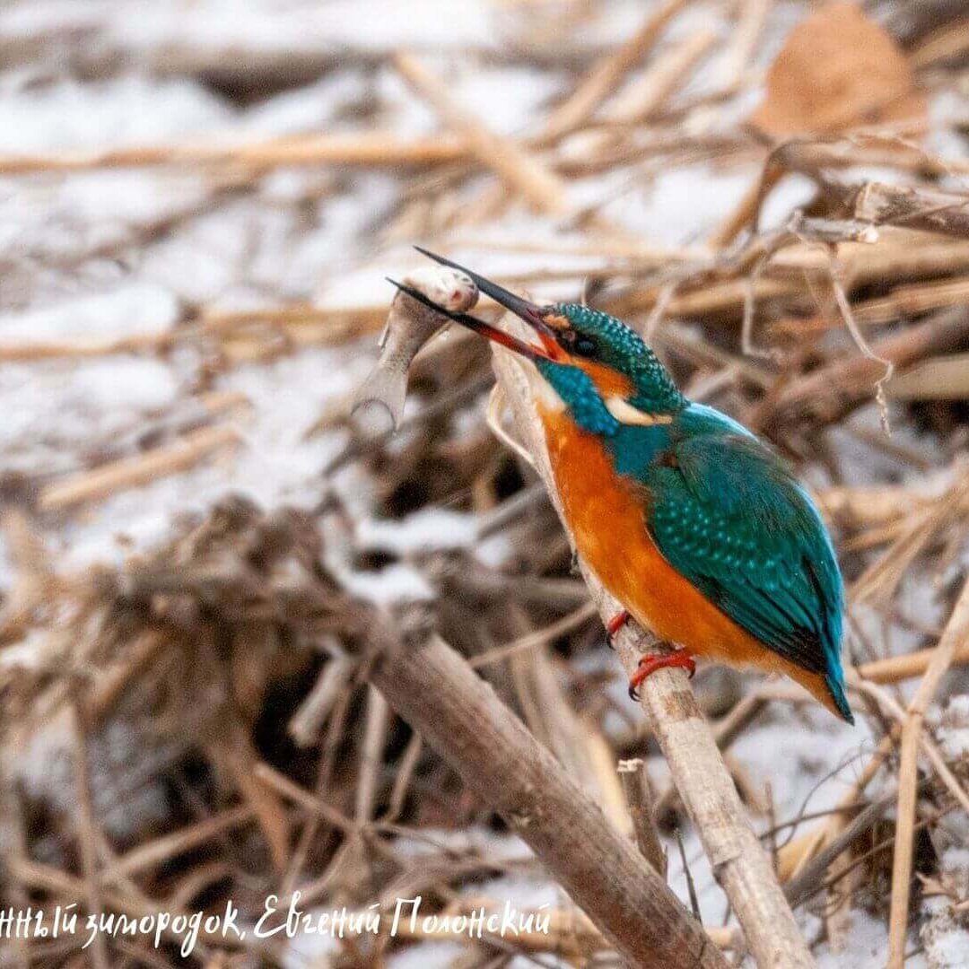 В третьем пункте мы расскажем об искусном рыболове – обыкновенном зимородке. Эта птичка небольшая, размерами несколько крупнее воробья. Верхняя сторона тела, голова и крылья тёмно-голубые, брюшко охристо-рыжее. На верхней части головы и крыльях тёмные и ярко-голубые пестрины или крапинки. Спина, надхвостье и кроющие перья хвоста ярко-голубые. От клюва к плечам тянется широкая голубая полоса. У основания клюва и за глазом рыжие пятна. Горло и бока шеи белые. Клюв длинный, прямой и мощный, тёмно-бурый. Ноги короткие и слабые, красные. Питается мелкой рыбой, водными насекомыми и их личинками, моллюсками, червями, лягушками. За добычей эта птица… ныряет. Да-да, увидев корм, она стремительно падает в воду и слегка погружается, хватая лакомство.