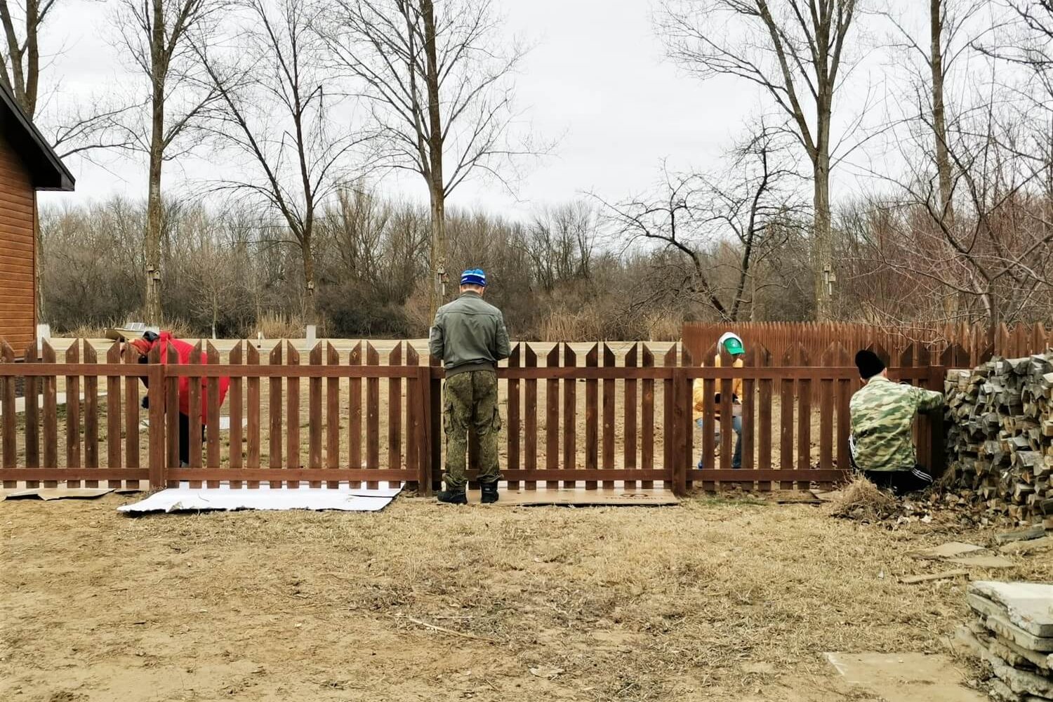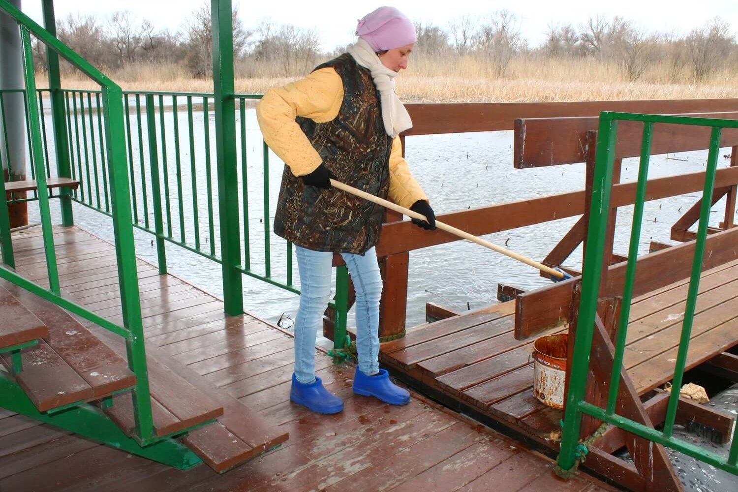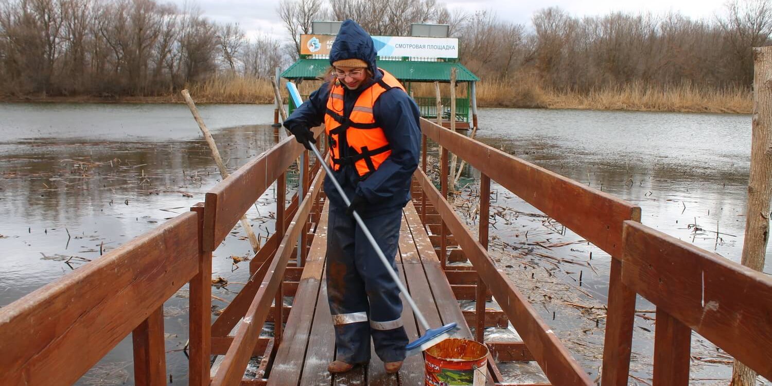 День волонтеров расписан буквально по минутам. Ранний подъём, утренняя зарядка на свежем воздухе для бодрости, занятия с научными сотрудниками или познавательные экскурсии, волонтёрский труд и вечерний досуг. Лениться некогда, да и сами волонтёры признаются, что и не особо хочется. У них одна общая задача – оказать помощь заповеднику. На это отведено 9 дней, а успеть нужно многое. Важным объектом волонтерского труда является экологическая тропа «Обретённая дельта». После зимы её тоже нужно привести в порядок – отмыть стенды, деревянный настил, перила, почистить смотровые площадки. Задача нелёгкая – длина тропы около 1700 метров. Новым объектом волонтерской помощи на этот раз стал деревянный забор, огораживающий территорию кордона, и протяженностью около километра. Это кропотливый и очень ответственный труд, но волонтёры довольны своими успехами. Например, Елена Дзюменко из Москвы поделилась: «Приятно видеть, каким становится забор под нашими руками. Сравниваем с непрокрашенными участками и радуемся».