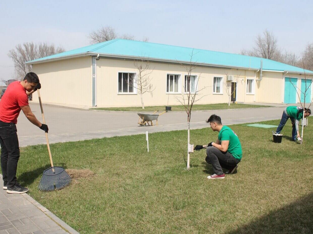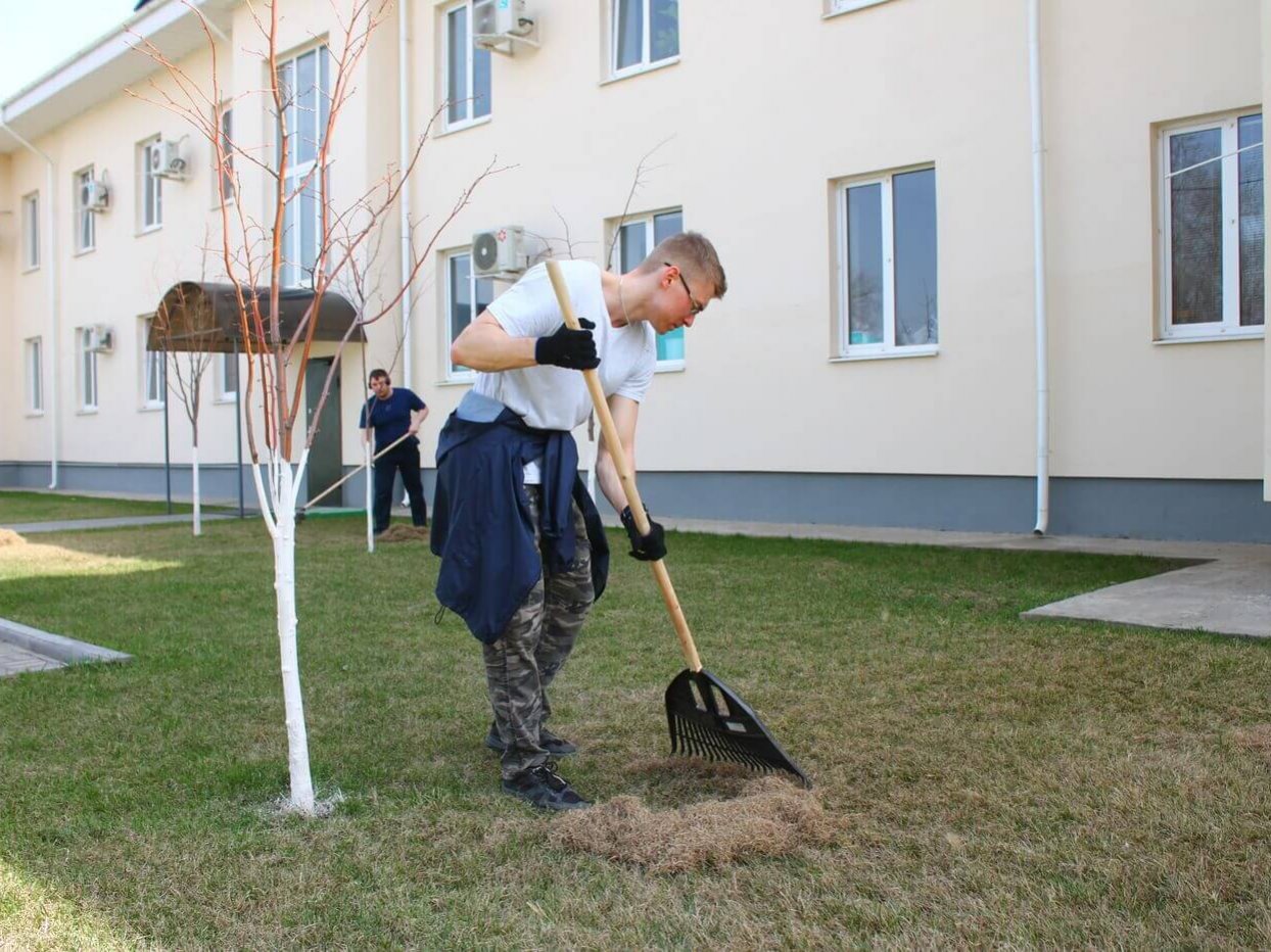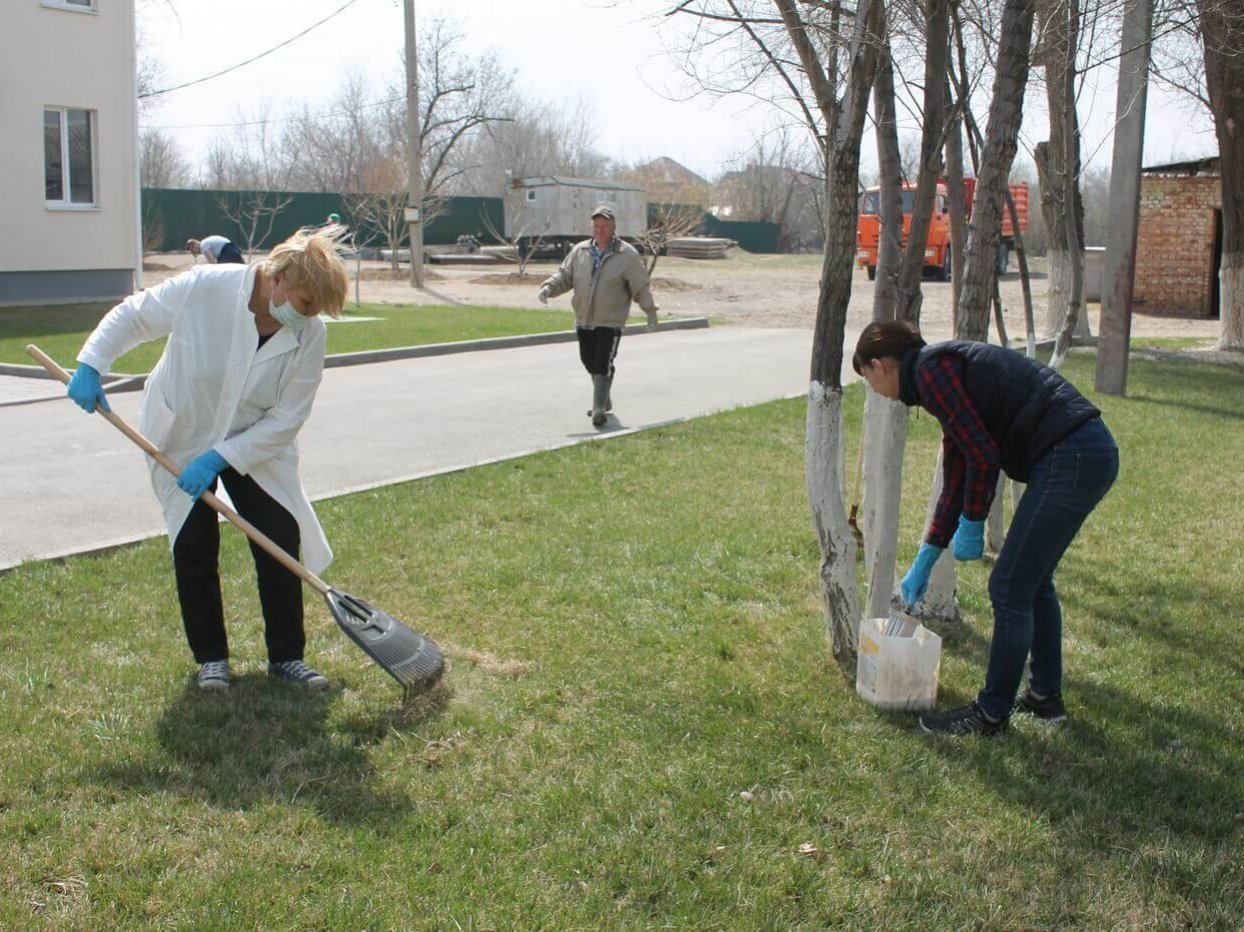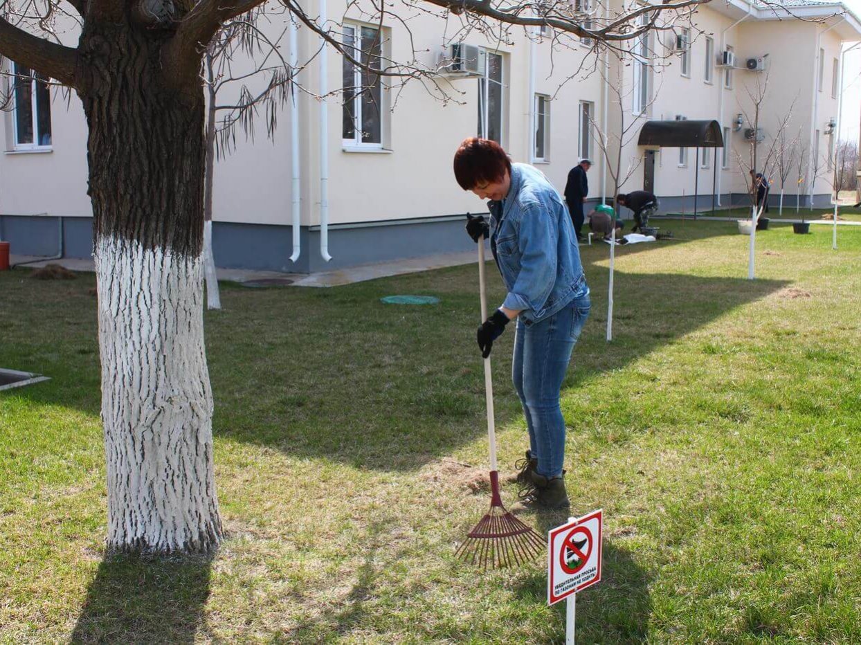 На территории Управления Астраханского заповедника работы было немного, т.к. благодаря постоянной и ответственной работе озеленителя Эдуарда здесь соблюдается почти идеальный порядок. Газон почистили от прошлогодней травы и листьев, собрали граблями мелкий мусор, принесённый ветром. Деревья побелили, чтобы защитить их кору от ожогов, насекомых-вредителей и перепадов температур. Особенно это полезно для молодых деревьев, у которых ещё не образовалась прочная кора. Также были высажены новые молодые деревья.