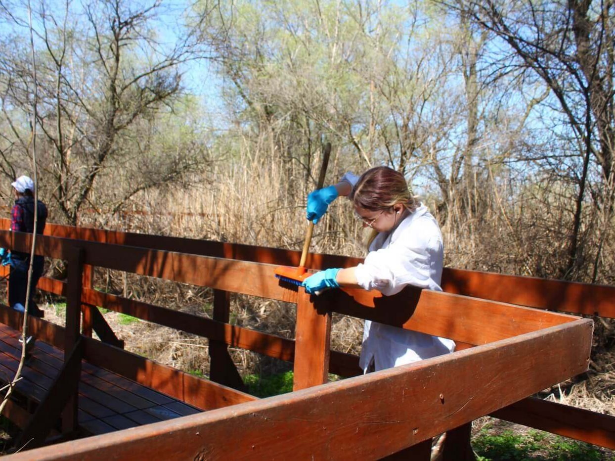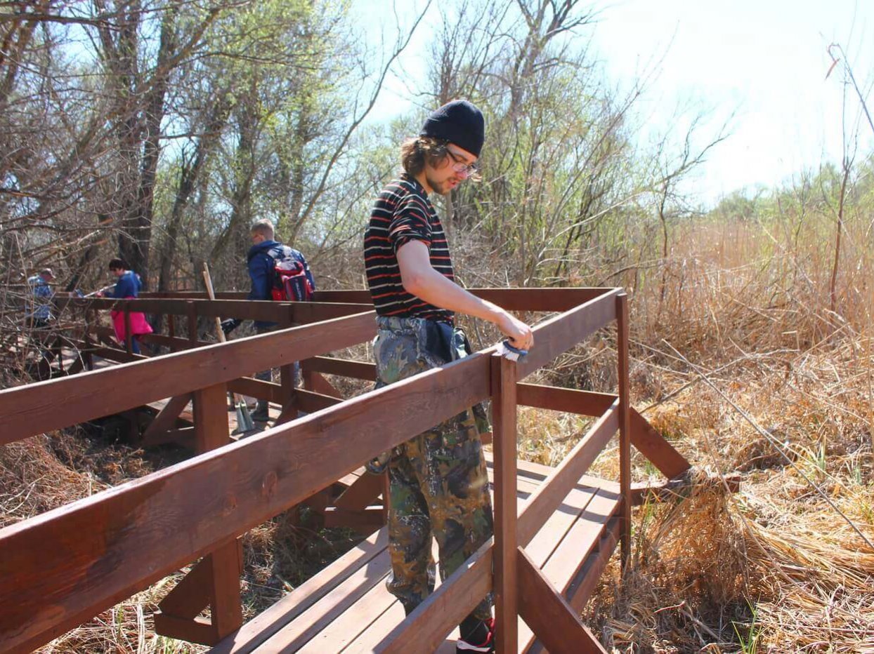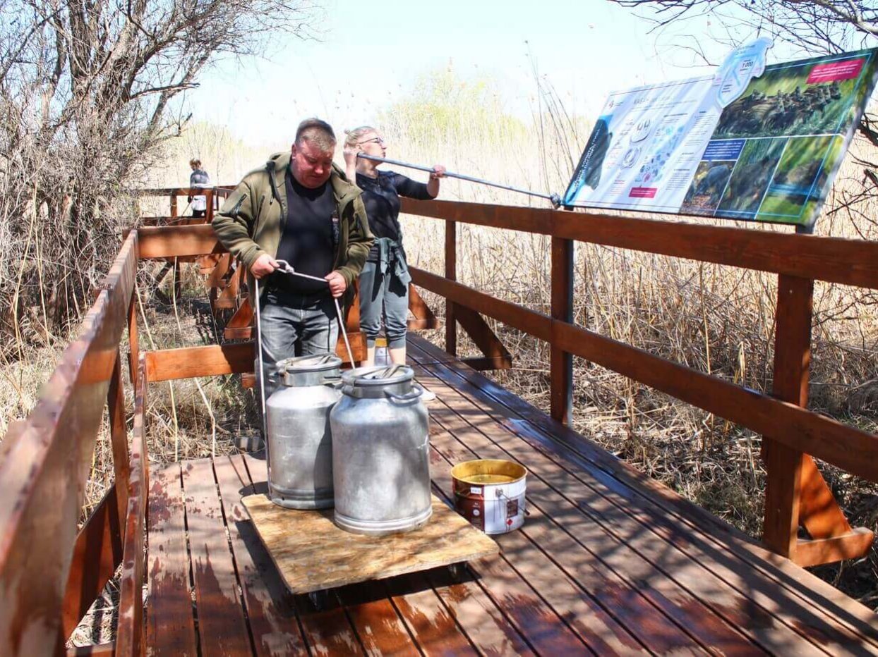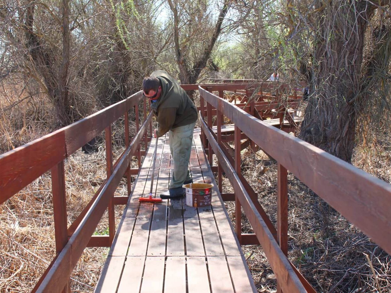 Ещё одним объектом трудового десанта была выбрана экологическая тропа «Обретённая дельта» на Дамчикском участке. Уже сейчас Астраханский заповедник посещают первые туристы, поэтому важно поддерживать объект туристической инфраструктуры в чистоте и порядке. К уборке были привлечены сотрудники Управления заповедника. Тропу тщательно вымыли от биологических загрязнений, «вооружившись» щётками и швабрами. Очень важно, что сотрудники, проживающие на центральном кордоне Дамчикского участка, постоянно следят за состоянием экологической тропы и регулярного проводят на ней уборку. Также сотрудники заповедника помогали волонтёрами красить забор вокруг центрального кордона Дамчикского участка протяжённость которого около километра. Сотрудники, проживающие на других участках заповедника, тоже присоединились к субботникам. Они наводили чистоту на своих кордонах и собирали мусор, который принесло водотоками.
