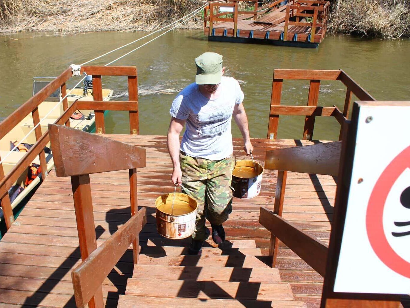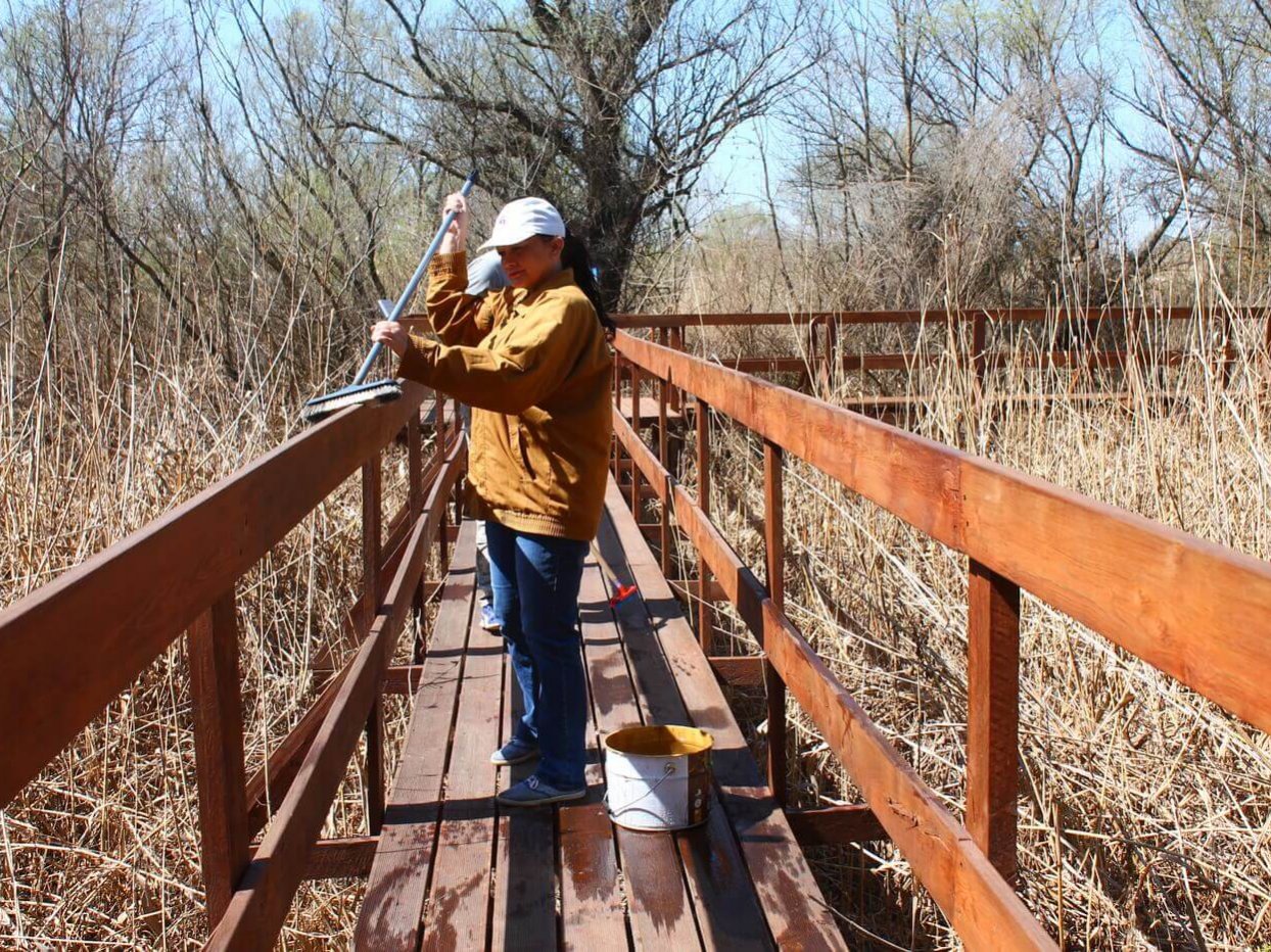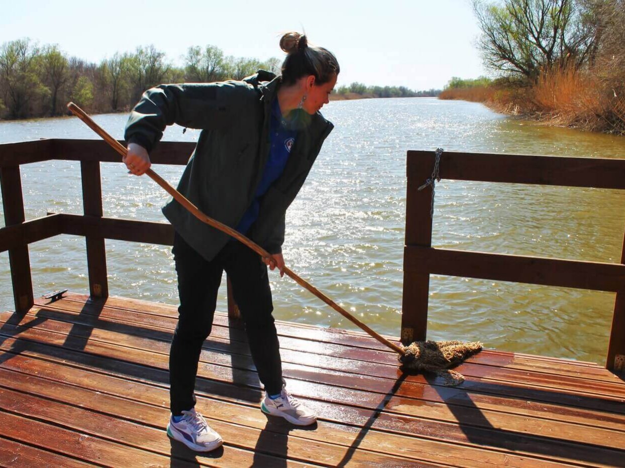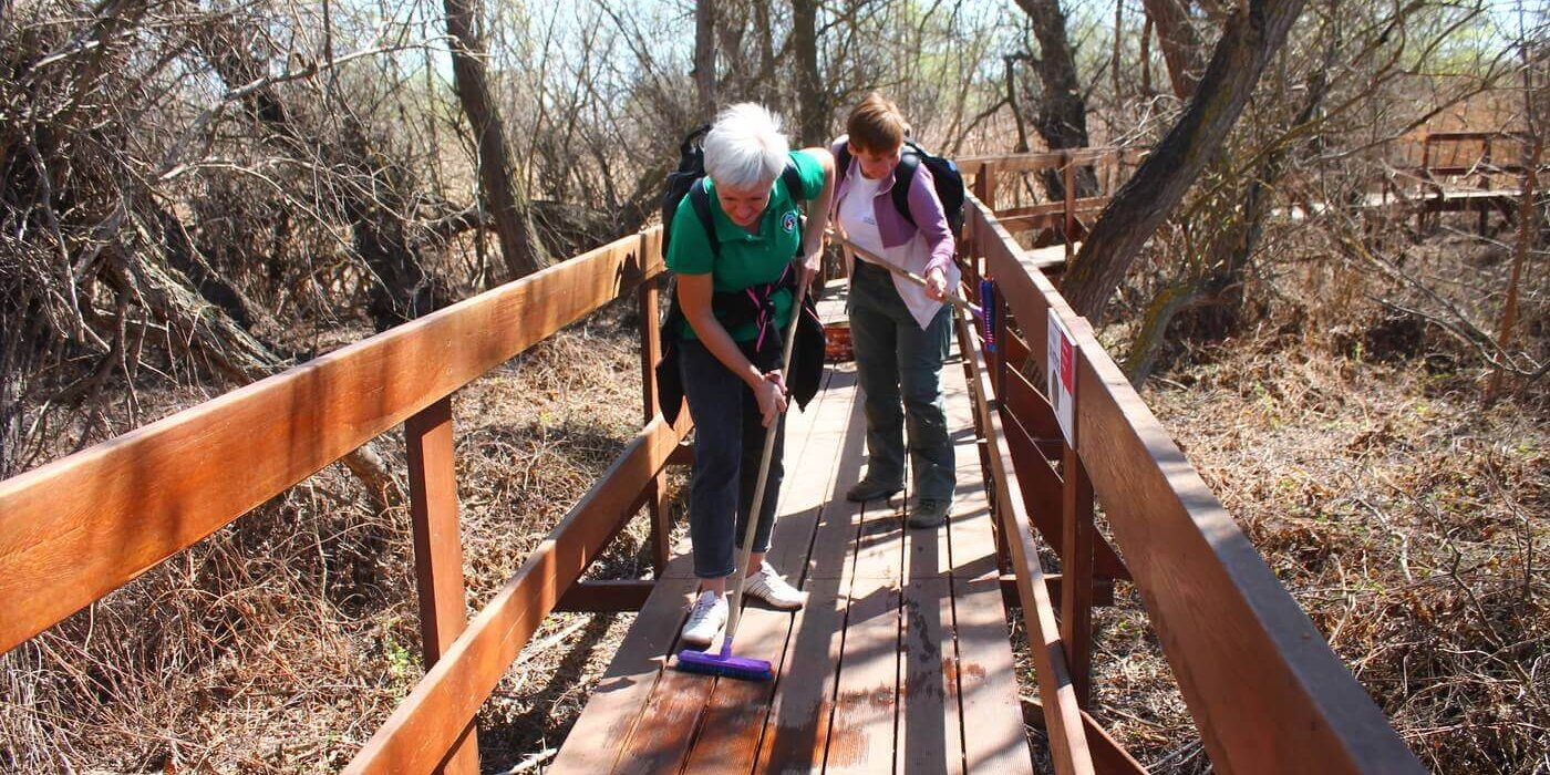 Ещё одним объектом трудового десанта была выбрана экологическая тропа «Обретённая дельта» на Дамчикском участке. Уже сейчас Астраханский заповедник посещают первые туристы, поэтому важно поддерживать объект туристической инфраструктуры в чистоте и порядке. К уборке были привлечены сотрудники Управления заповедника. Тропу тщательно вымыли от биологических загрязнений, «вооружившись» щётками и швабрами. Очень важно, что сотрудники, проживающие на центральном кордоне Дамчикского участка, постоянно следят за состоянием экологической тропы и регулярного проводят на ней уборку. Также сотрудники заповедника помогали волонтёрами красить забор вокруг центрального кордона Дамчикского участка протяжённость которого около километра. Сотрудники, проживающие на других участках заповедника, тоже присоединились к субботникам. Они наводили чистоту на своих кордонах и собирали мусор, который принесло водотоками.