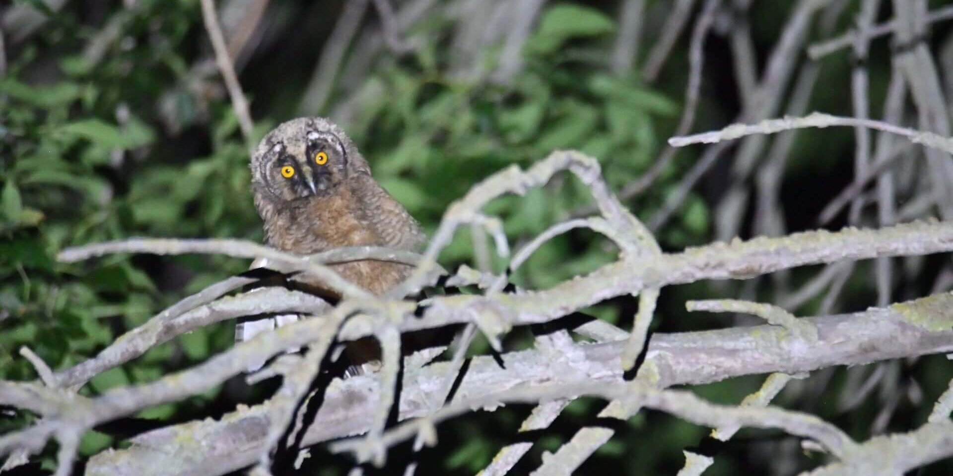 Породой даже на центральном кордоне Дамчикского участка Астраханского заповедника, где постоянно есть люди, можно понаблюдать за интересными сценами из жизни заповедных обитателей. Кого здесь только не встречали – слётков черноголовых сорокопутов, сизоворонок, золотистых щурок, фазанов, скворцы селятся каждую весну в скворечниках, а ещё обыкновенных шакалов, ужей, болотных черепах, конечно же, ушастых ежей и многих-многих других. Животные, привыкшие к безопасности, не против близкого соседства с людьми и воспринимают их как данность. Недавно орнитолог Наталья Мещерякова и геоботаник Наталья Литвинова обнаружили на дереве на кордоне слётка ушастой совы. Слётками называют птенцов, которые недавно покинули гнездо и готовятся ко «взрослой» жизни. Совёнок сидел на ветке и протяжным писком звал своих родителей. Подобным образом птенцы выпрашивают корм. Слёток не обратил внимания на людей, которые за ним наблюдали. Рядом был слышен писк другого птенца, вероятно, брата или сестры. Второй слёток постоянно перелетал с дерева на дерево – учился таким образом летать. Ушастые совы ведут строго ночной образ жизни, в темноте и охотятся. Птенцы тоже учатся летать в темноте, сначала совята перемещаются по веткам, а затем перелетают с дерева на дерева. Кстати, ушастых сов постоянно отмечают на кордонах заповедника. Понаблюдать за совёнком можно на видео ниже.