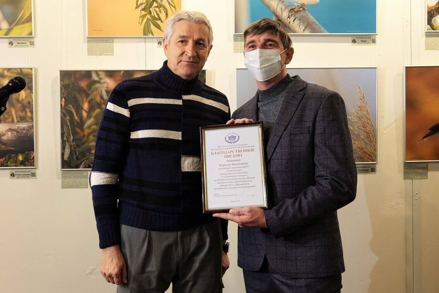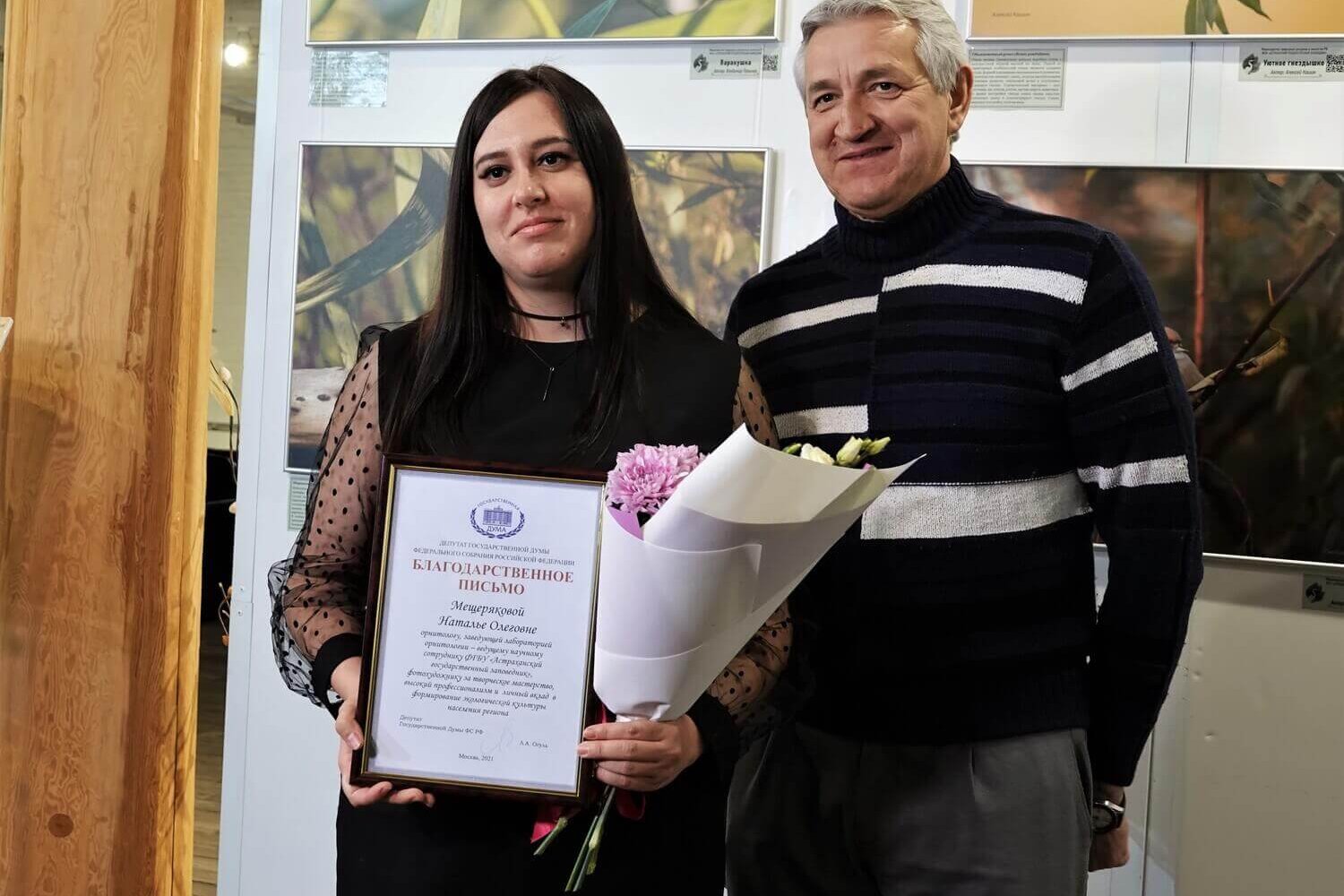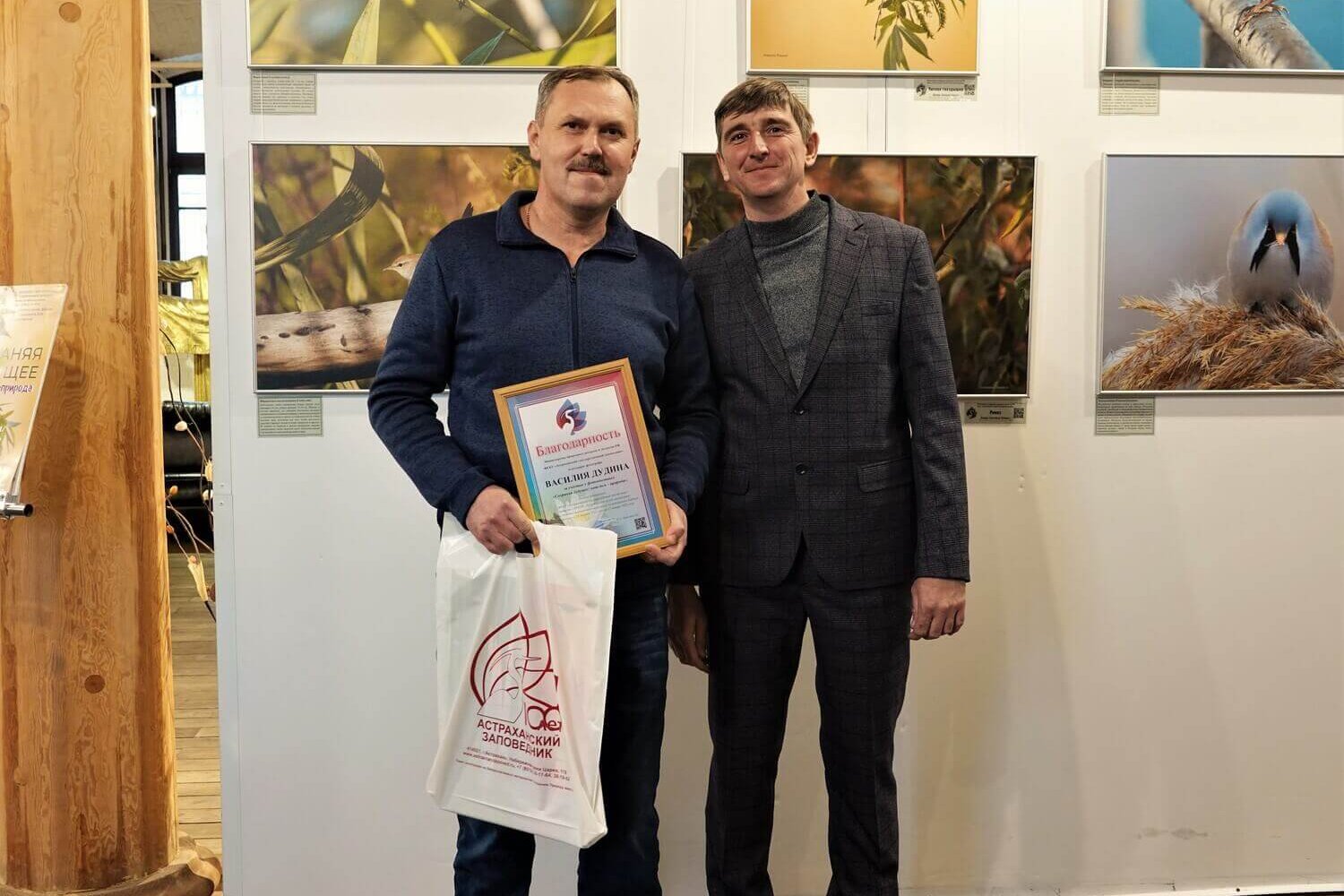 С приветственным словом к гостям фотовыставки выступил депутат Государственной Думы Федерального Собрания Российской Федерации Леонид Огуль, который является постоянным партнёром Астраханского заповедника и поддерживает эколого-просветительские мероприятия. Он поблагодарил всех фотографов-участников за проделанную работу и невероятные снимки и выразил надежду, что с каждым годом подобных фоторабот будет становиться только больше. В заключение приветственного слова Леонид Огуль наградил благодарственными письмами участников фотовыставки за творческое мастерство и формирование экологической культуры населения региона – Алёну Рыжову, Наталью Мещерякову, Дмитрия Власова и Владимира Панькова, а также Кирилла Литвинова за плодотворную научную и просветительскую деятельность.