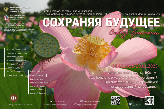 30 декабря в МВК «Цейхгауз» в Астраханском Кремле откроется зимняя выставка Астраханского биосферного заповедника «Сохраняя будущее – сквозь времена». В экспозиции – около 80 фоторабот, раскрывающих уникальную красоту и природы Астраханского края, а также картины, демонстрирующие природную самобытность через призму взгляда профессионального художника. Фотовыставки Астраханского заповедника стали доброй традицией, дарующей астраханцам возможность в самом сердце города…