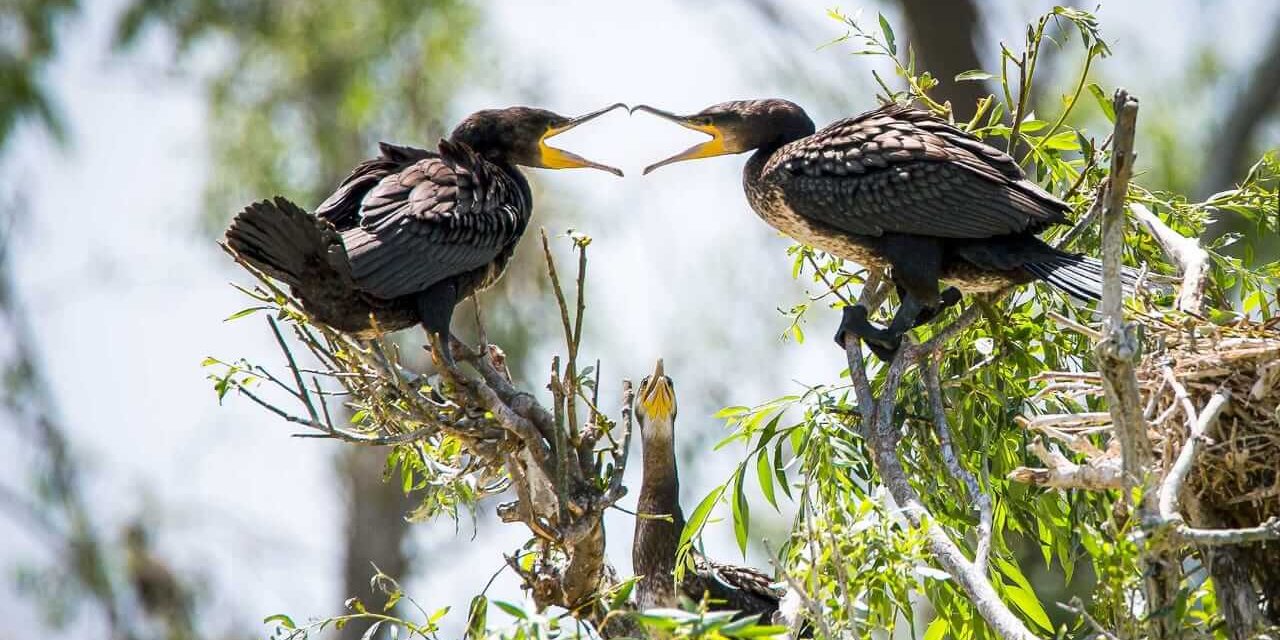 Евгений Полонский – коренной астраханец, он здесь родился и вырос. Фотосъёмки дикой природы он проводит уже почти двадцать лет. Его главная миссия – показать всему миру красоту Астраханского края, поэтому он почти никогда не снимает в других местах. Он может провести в засидке или на вышке несколько суток, чтоб получить удачный кадр. Он прекрасно понимает, что природа позировать не будет, а для интересного снимка нужно уметь наблюдать, ждать и замечать. Фотография бакланов была сделана на Обжоровском участке Астраханского заповедника с вышки около колонии птиц. Евгений Полонский несколько дней наблюдал с вышки за пернатыми. Однажды его привлекло интересное поведение молодых больших бакланов. Уже подросшие и окрепшие птицы потихоньку выбирались из гнезда на соседние ветки, но родители до сих пор носили им воду. А слётки спорили между собой, кто первым получит «угощение», и щёлкали клювами друг на друга. Кадр по меркам фотографа-натуралиста был сделан довольно быстро – всего за час наблюдений.