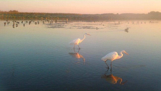 Грациозные большие белые цапли, словно пушистые белые облака, прогуливаются по водной глади. В какой-то момент их движения настолько синхронизируются, что они начинают идти нога в ногу. А на фоне сзади – настоящие птичьи базары вдоль зарослей лотоса. Вся гармония заповедной природы в одном кадре, не иначе. Видео от мастера по фотоловушкам Евгения Полонского
