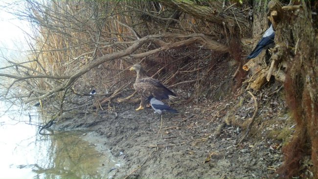 Как известно, там, где орлан-белохвост с добычей, там обязательно и вороны, которые хотят урвать лакомый кусочек. Орлану-белохвосту пришлось даже отгонять назойливых гостей от желанной рыбки и попытаться спрятаться от них в «кусты». Воронам осталось лишь доедать жалкие крохи с богатого стола. Видео от Евгения Полонского